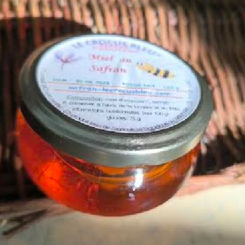 Miel au Safran 110g, mélange d'un Miel de Safran et d'un Miel d'Acacia, produit par le Crocus Bleu à Najac.